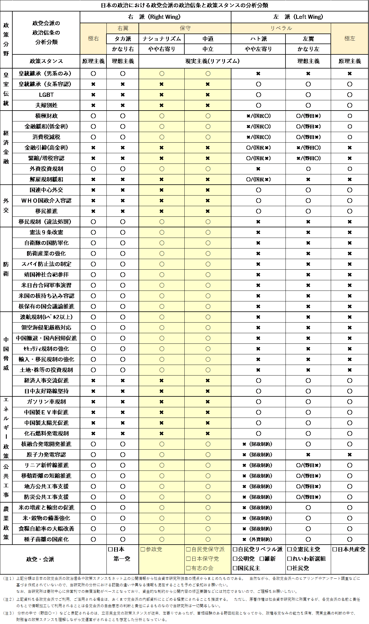 図表の「日本の政治における政党会派の政治信条と政策スタンスの分析分類」で整理されている通り、同じ自民党でも保守派とリベラル派では、その政策を推進するスタンスが全く異なっている。 自民党の保守派は、むしろ日本保守党や有志の会、参政党と同じ政策を推進できる立場にあり、低金利の継続による金融緩和を続け、