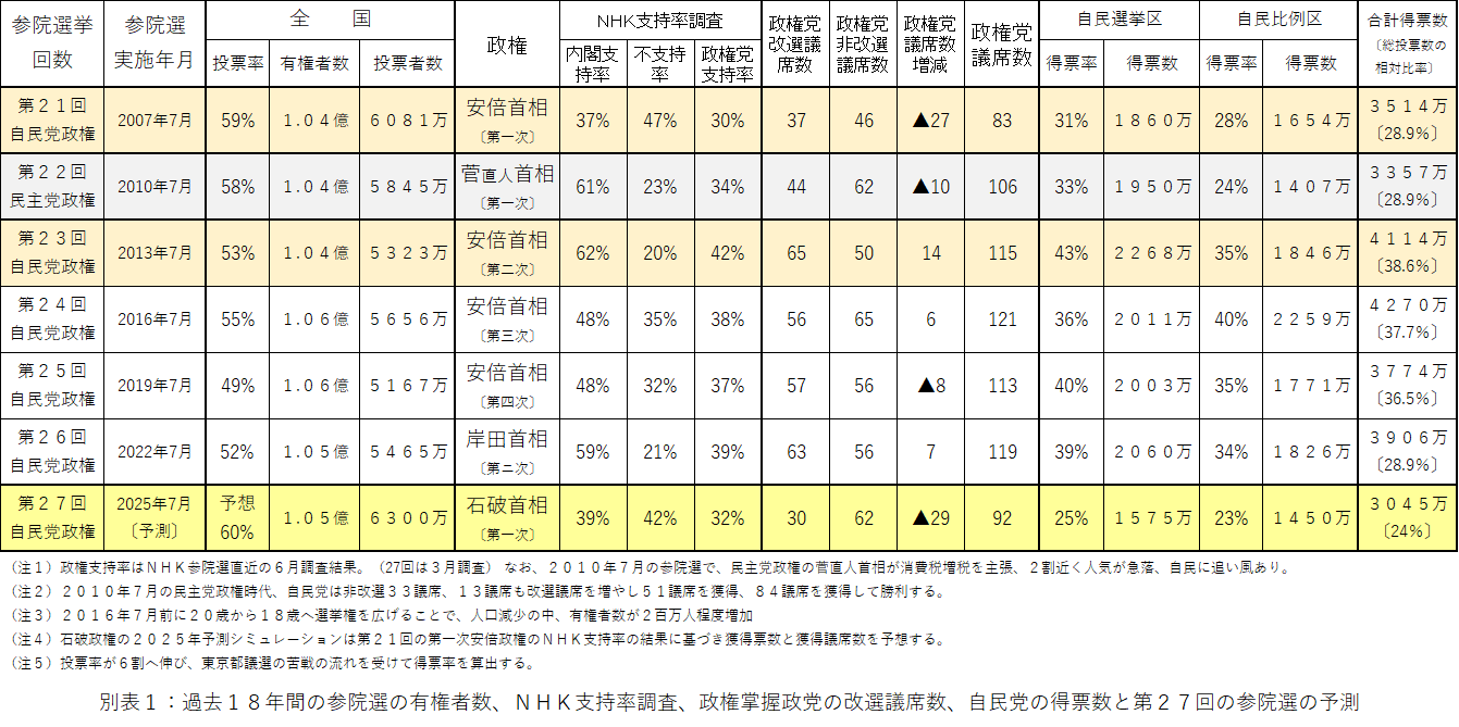 別表1の通り2007年7月の第21回自民党政権の時の37議席もさらに7議席も下回る見