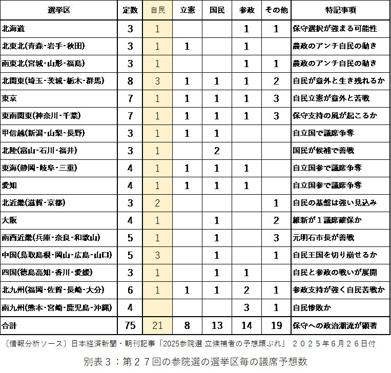 別表3で今度の参院選の選挙区毎の議席予想数を分析したが、75議席のうち自民党21議席、 参政党14議席、国民民主党13議席、立憲民主党8議席、その他日本誠真会1議席など保守系 政党の著しい躍進が見込まれる。 すでに国民の多くが、外国人、特に中国系移民の異常な増加 にかなりの危機感をもっており、公約にその対策を明確に打ち出した参政党へかなりの票が逃げ る予想となっている。 外国人参政権など移民に甘く、夫婦別姓制度を推進するリベラル色の強 いイメージの立憲民主党が苦戦する見込みである。 国民民主党も保守政党へのイメージ脱皮を 推進したが、リベラル色の強い有名候補の擁立や連合との関係で戸籍制度の破壊につながる夫婦 別姓制度の支持に保守層の多くの票が参政党へ流れるとみている。 以上の予想は、アンケート でもテレビや新聞などオールドメディアの集計数字より、ネットメディアのアンケート分析が大 きく影響しており、全体的に自民党や立憲民主党など既存の政党へ厳しい見方となっている。 そのため、予想が大きく外れるケースもあることを予めお含みおき願いたい。