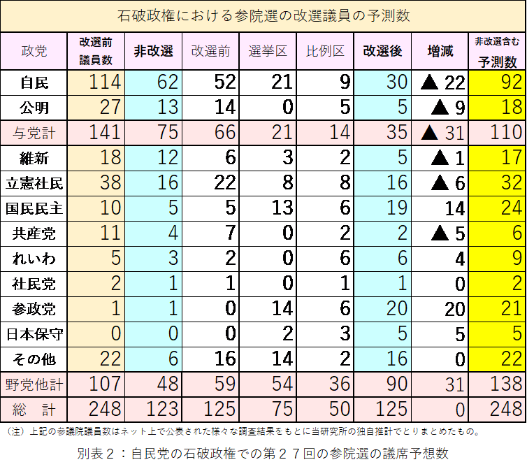 る最新の予想は、別表2の通り改選後の自民の議席数が23から30へ引き上がったが、公明党