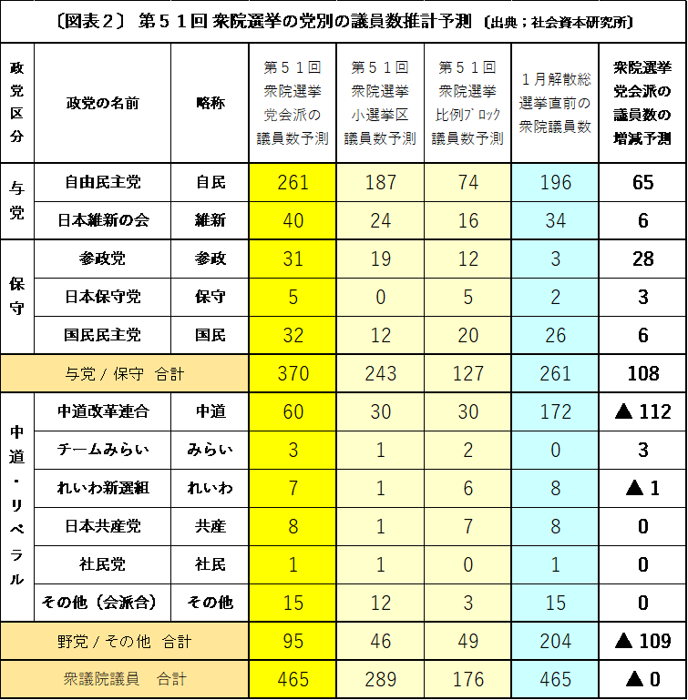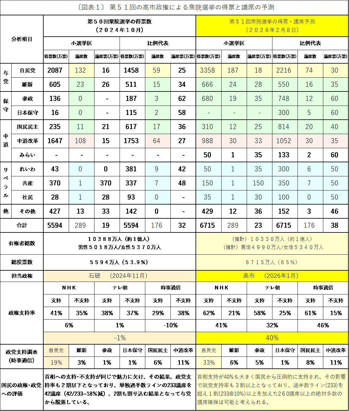 2024年10月の第50回の衆院選の選挙分析を踏まえ、今回の2026年2月8日投票の第51回の衆院選の選挙予測分析をおこなったがその結果は下記の図表1となった。