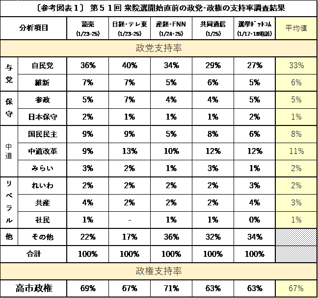 参考資料1では、衆院選の開始直前の政党、政権の支持率調査の結果をとりまとめてみた。 この平均値を自民党の比例配分予測に活用させてもらった。